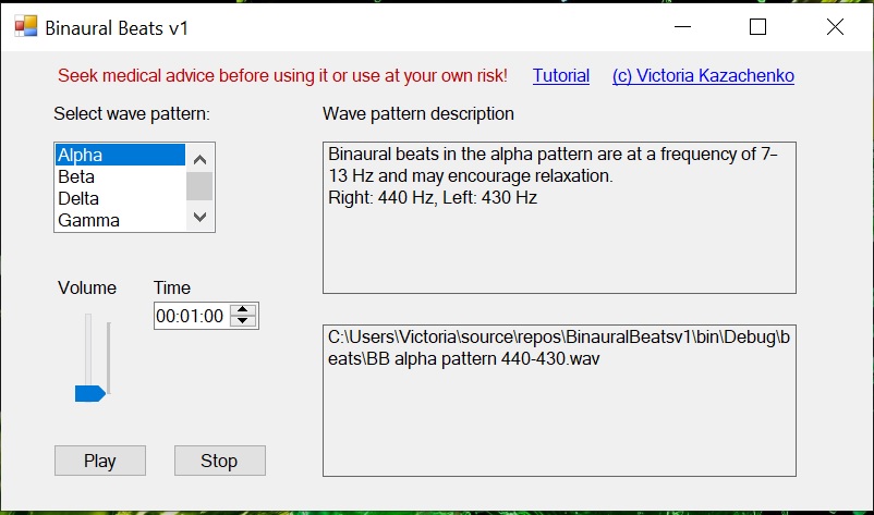 From the Wave patter list box user can select a pattern. Description of the pattern will appear to the right. Filename of the file played in the background will appear on the right bottom. User can set up the time he wants to play beat for and the volume. Then user can press Play button, when beat is played user can adjust volume. To stop user can press Stop button. To change a pattern of beats user should press Stop, select new pattern and press Play.