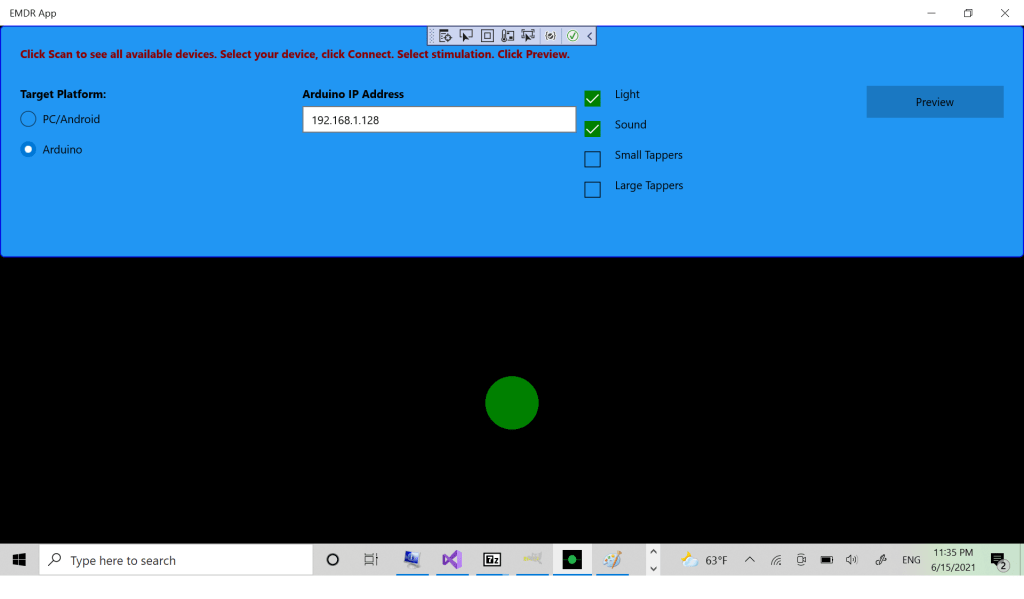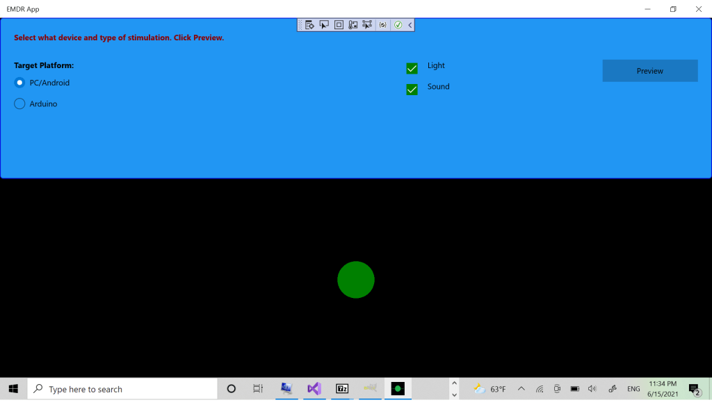 Первый экран позволяет вам выбрать как вы будете использовать приложение. Oпция PC/Android использует для работы только ваш компьютер/телефон/планшет, опция Arduino позволяет использовать самодельную модель EMDR машины. Здесь описано как собрать эту машину.
