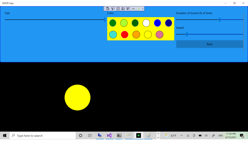 Нажатие в любое место на нижней панели второго экрана убирает верхнюю панель с параметрами, чтобы клиент мог сфокусироваться на движущемся по черному экрану шарике и звуке. Повторное нажатие останавливает стимуляцию, чтобы терапевт мог приостановить сессию и задать клиенту наводящие вопросы. Следующее нажатие возвращает вас на второй экран, где можно опять настроить параметры стимуляции чуть быстрее, другой цвет и т.д. Следующее нажатие опять убирает панель с параметрами. И так по кругу.
